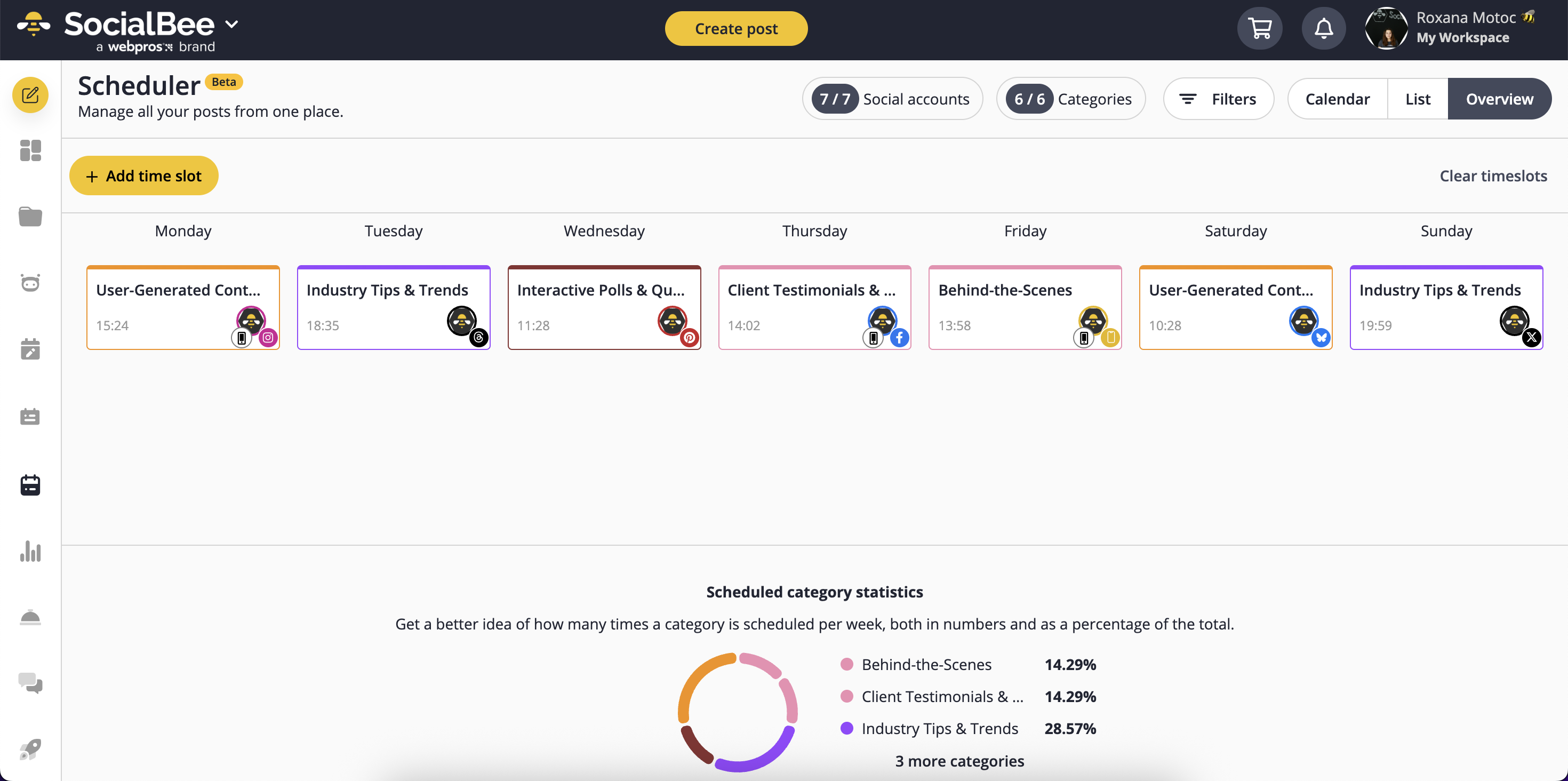 Once you generate the preset schedule, you'll also see category statistics, so you can make additional adjustments if needed (e.g., add more categories in the schedule, edit the posting times, etc).