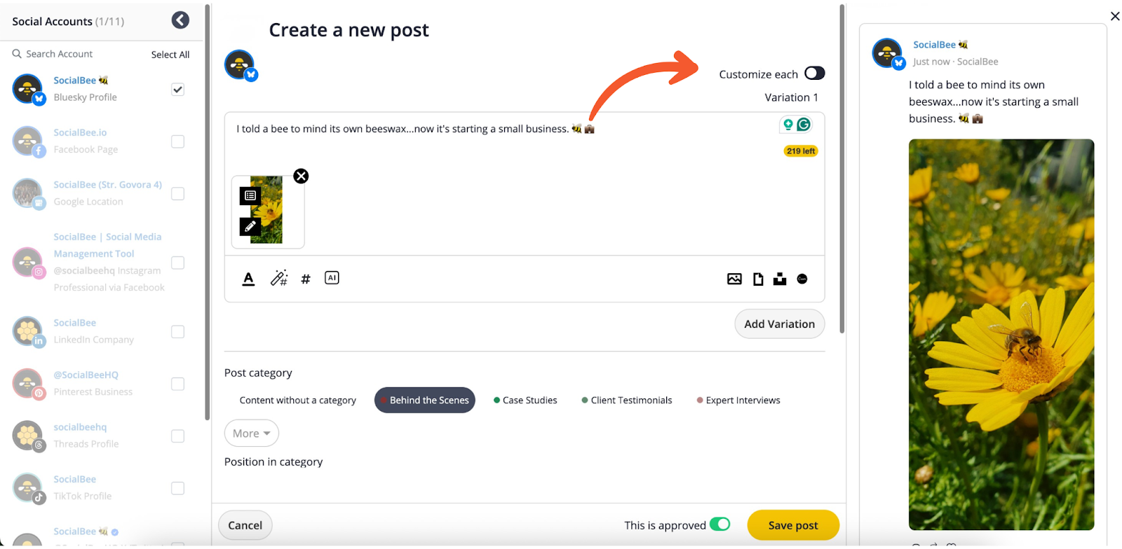 - If you’re posting the same post across multiple social media accounts, turn on the “Customize each” toggle to create unique versions for each platform.
