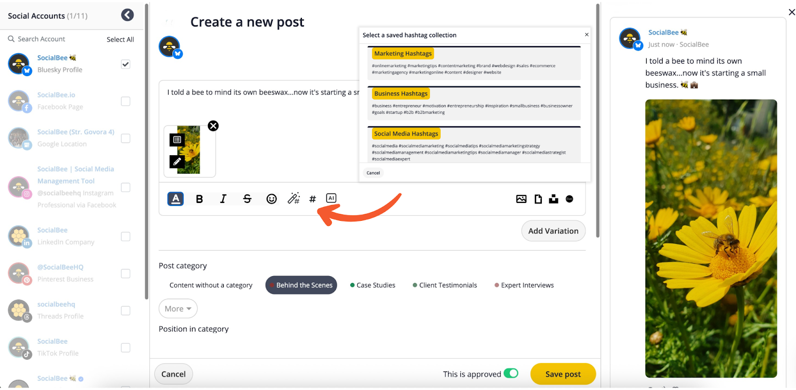 - Save hashtag sets by clicking the simple “#” and reuse them in future posts.