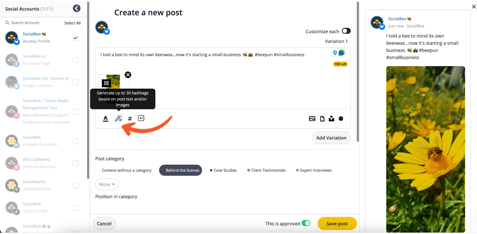 - Click the Hashtag Generator icon (wand + hashtag) to get relevant hashtags based on your caption and media.