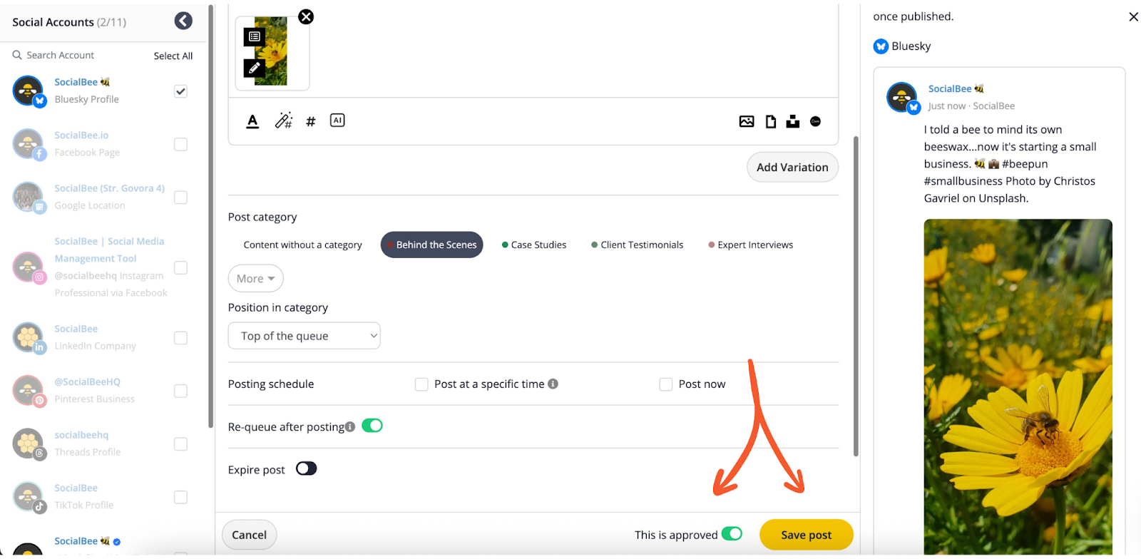 - Click “Save post.” Your Bluesky content will go live automatically at the date and time you’ve set for it.