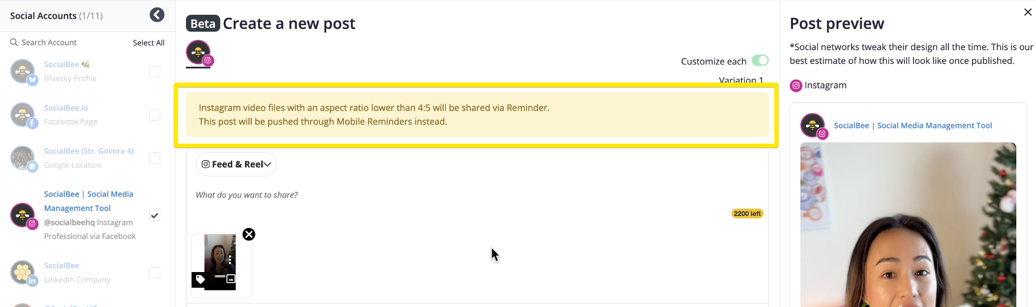 - Instagram Creator & Personal Profiles: Instagram Reels are published via Reminders, meaning you’ll receive a notification to manually publish the Reels through the SocialBee mobile app.