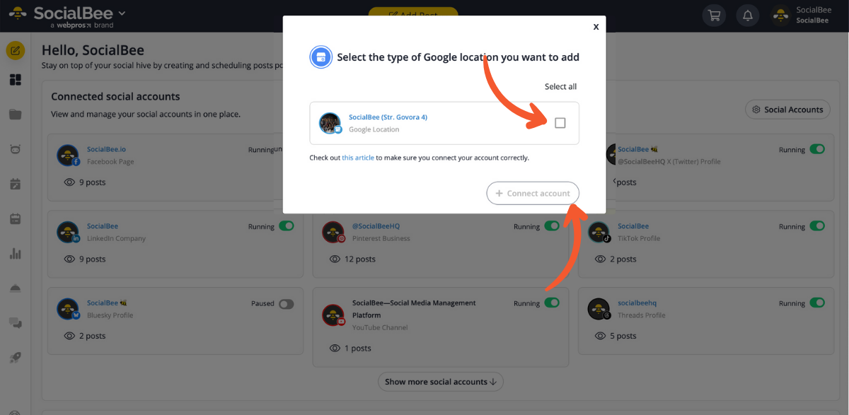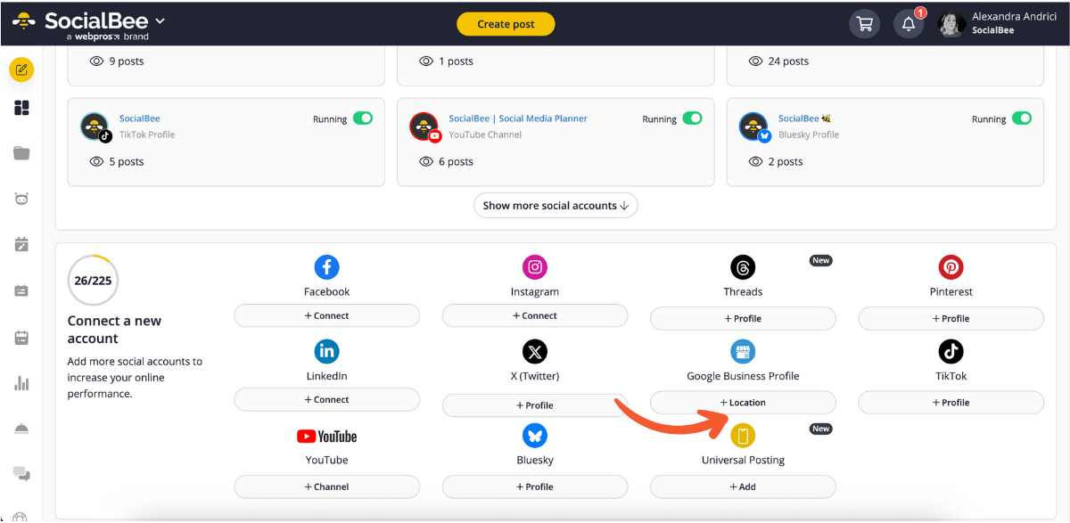 Once you know what you can post, the next step is to connect your Google Business Profile to SocialBee.