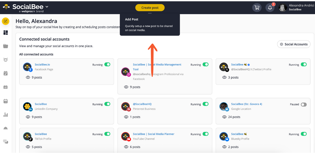 - From any screen in SocialBee, click “Create Post.”
