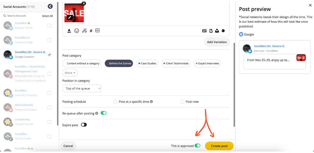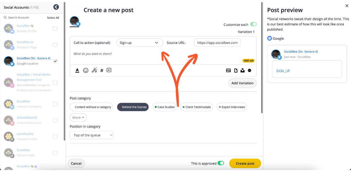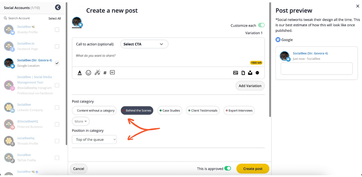 Once your access is confirmed, you’re ready to start creating and scheduling your posts directly from SocialBee. Now, let’s look into how to post on Google My Business.