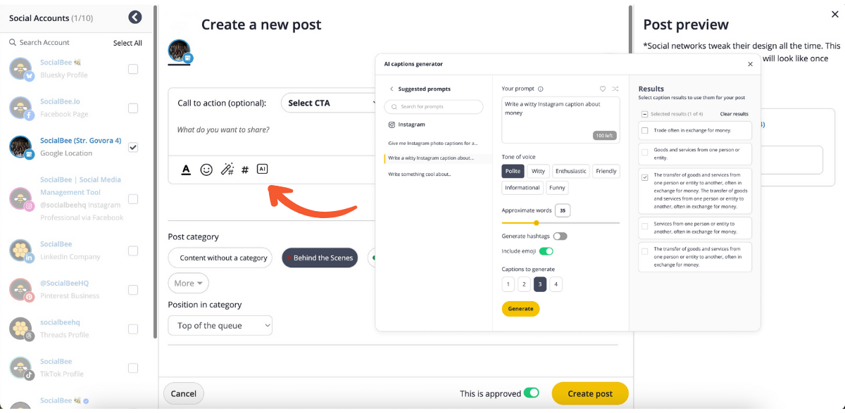 - Write your caption or click the AI button to instantly generate your text, images as well as more post ideas.