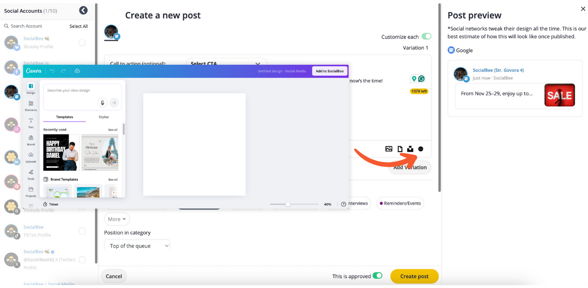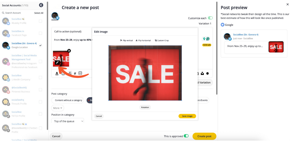 With your Google Business Profile connected, you can create and schedule updates directly from your SocialBee dashboard. The process is intuitive and gives you complete control over your post design and timing.