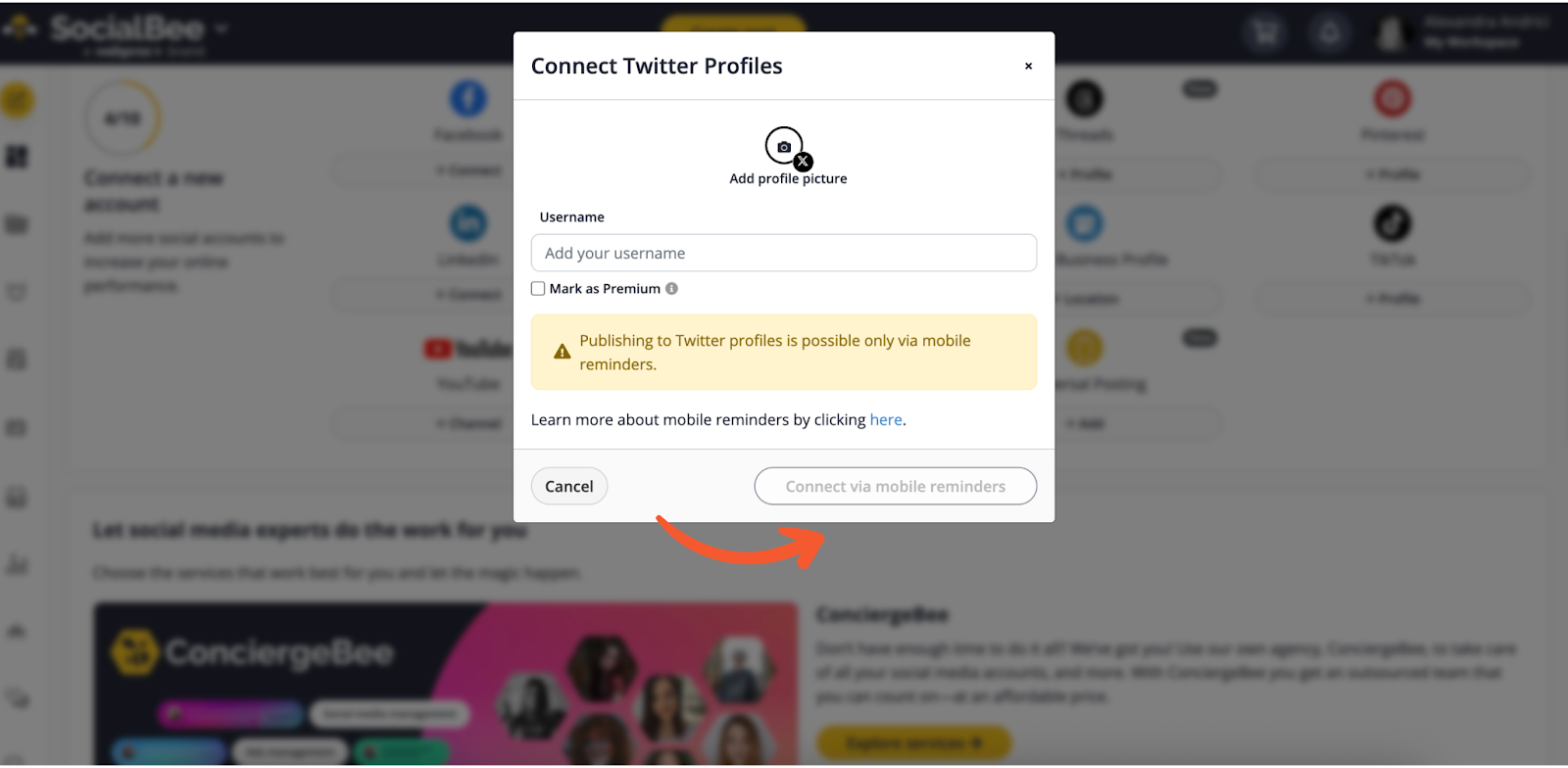Without the add-on, publishing is available only through mobile reminders, so you’ll need to connect via mobile reminders. More about posting on Twitter (X) via Reminders later in the article.