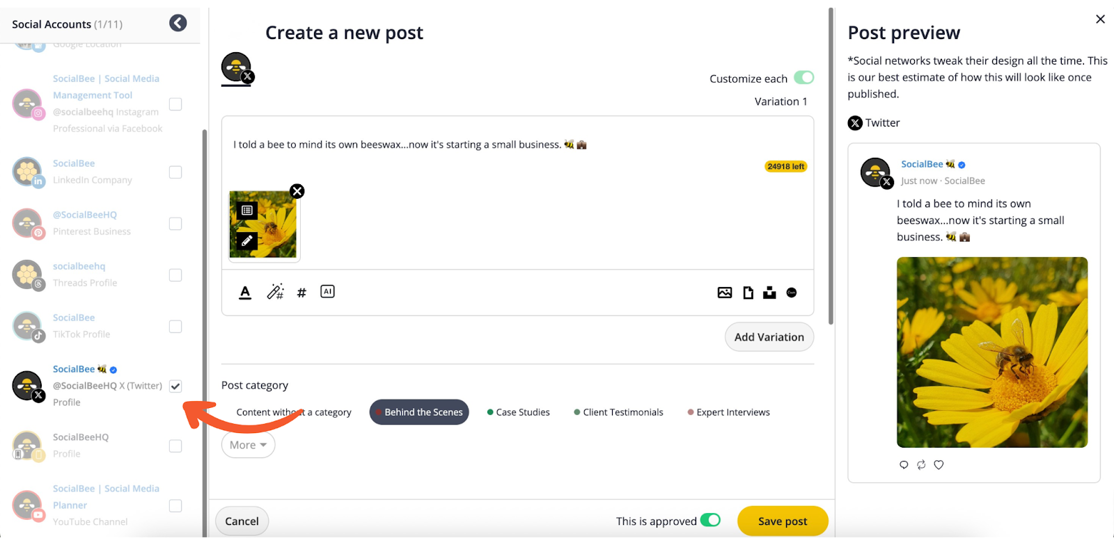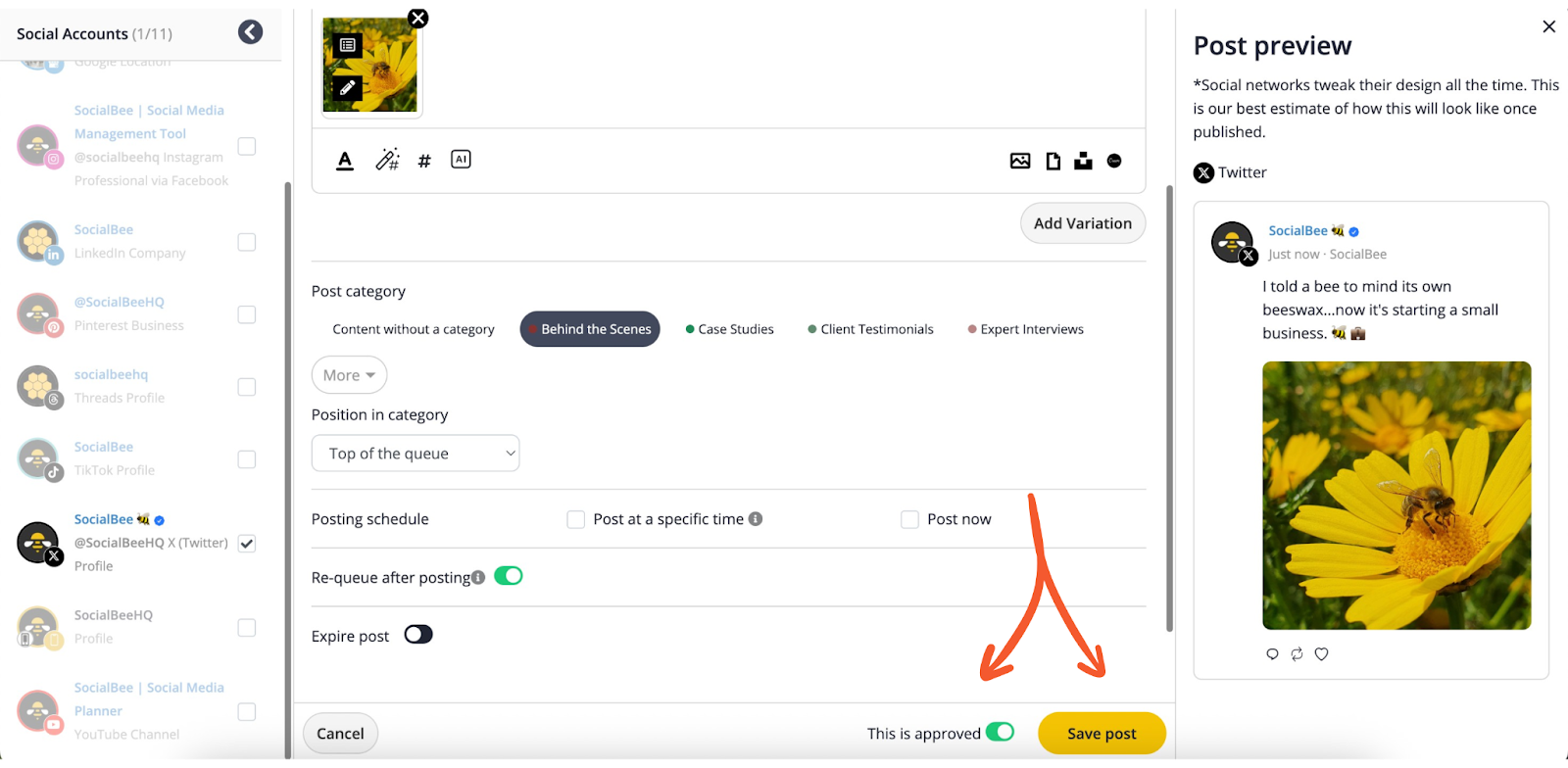 3. Click “Save post” from the bottom right side of the screen to finalize. Your tweet will go live automatically at the date and time you’ve scheduled.