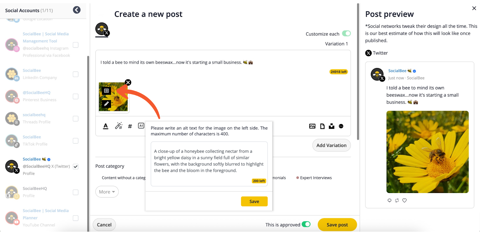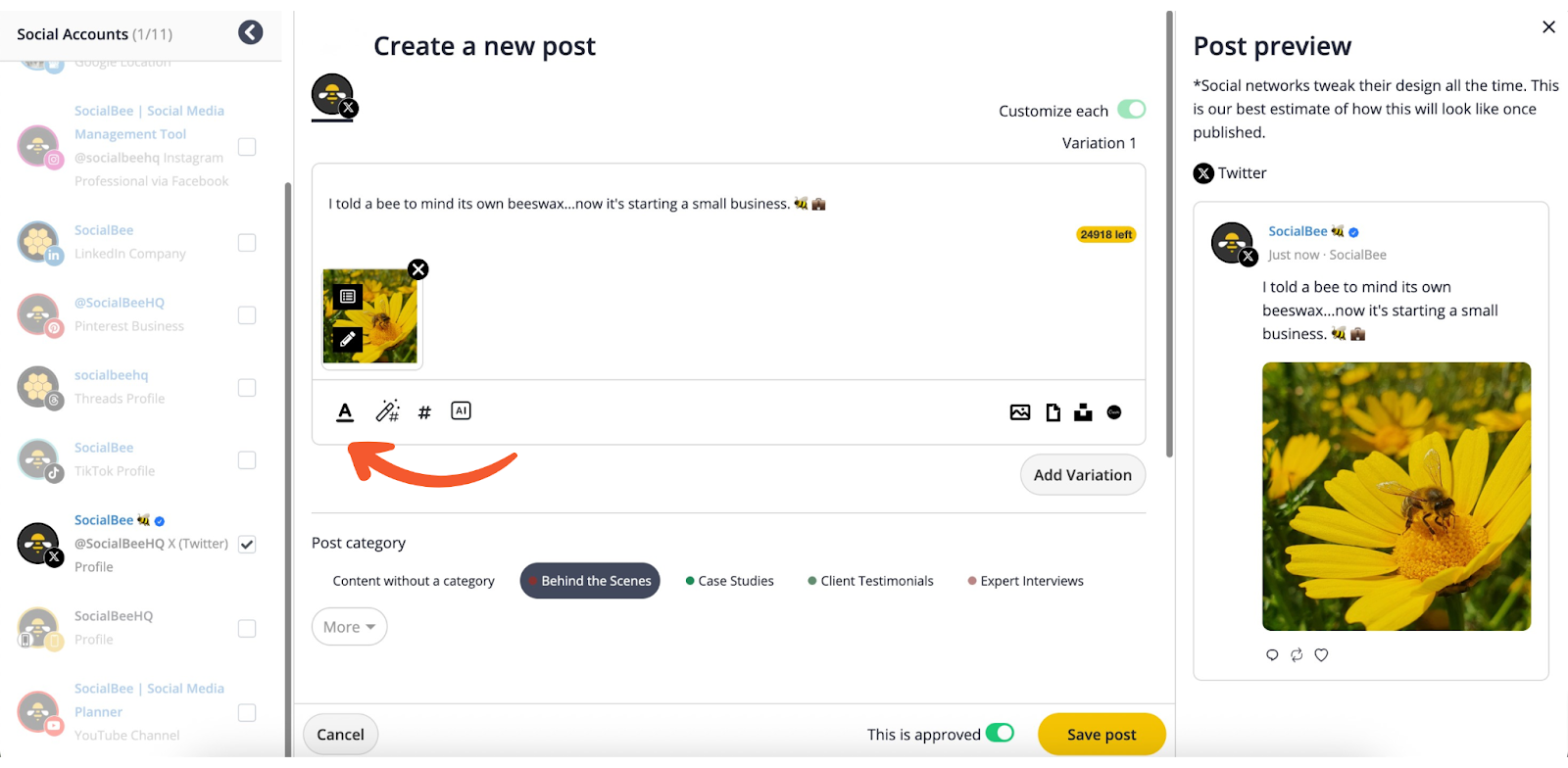 • If you have an X Premium account, you can create and publish posts up to 25,000 characters long directly in SocialBee.