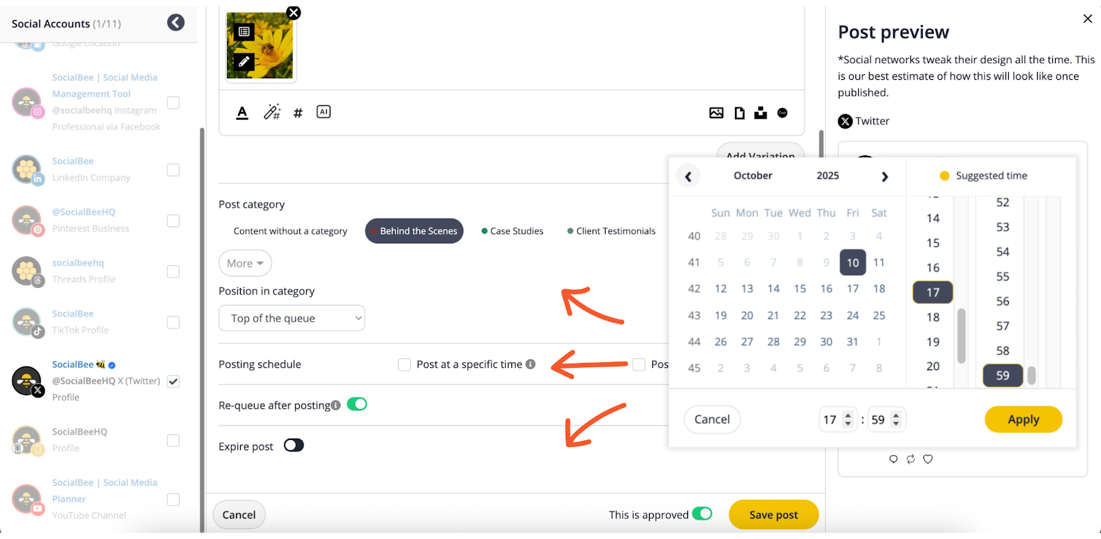 SocialBee allows you to schedule multiple tweets ahead of time, so you can stay active on X even when you’re offline.