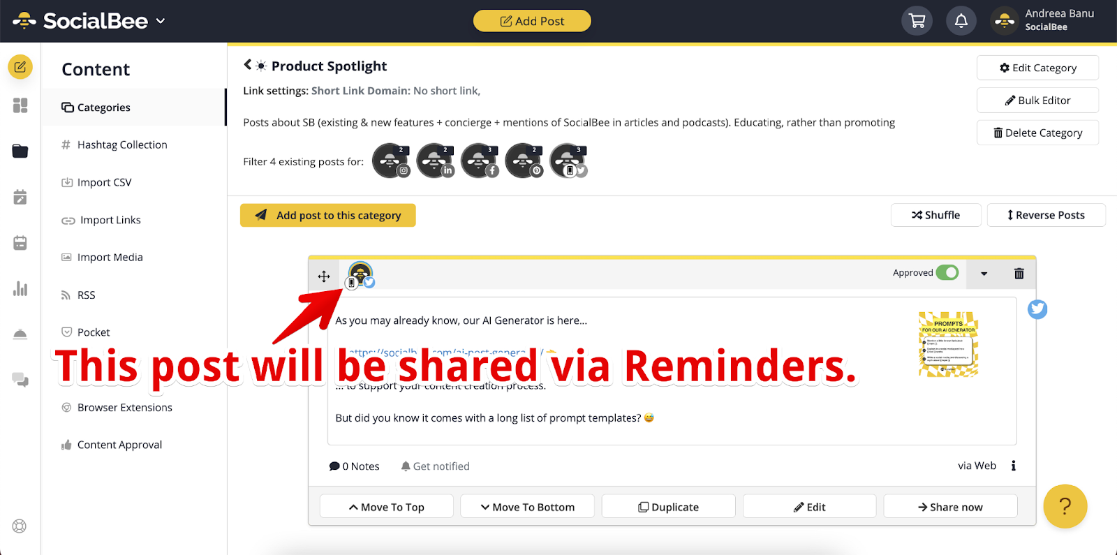 1. To post via Reminders, set up the SocialBee mobile app on your mobile device. Read more about this here →