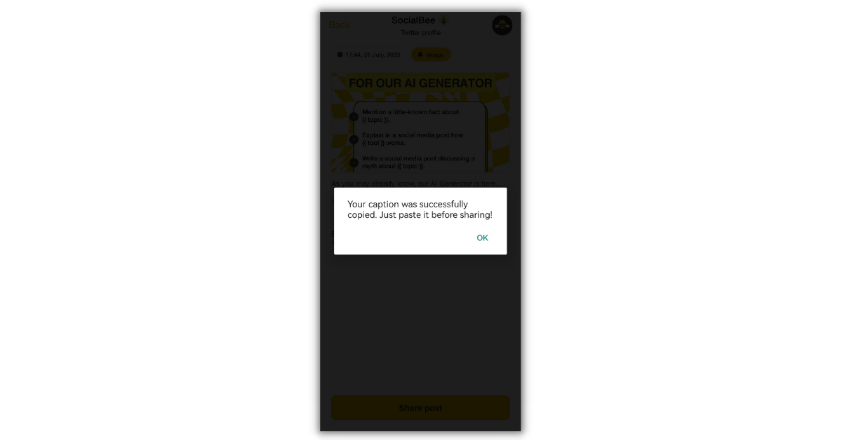 1. Tap on "Share post" and you will receive confirmation that your caption was copied.