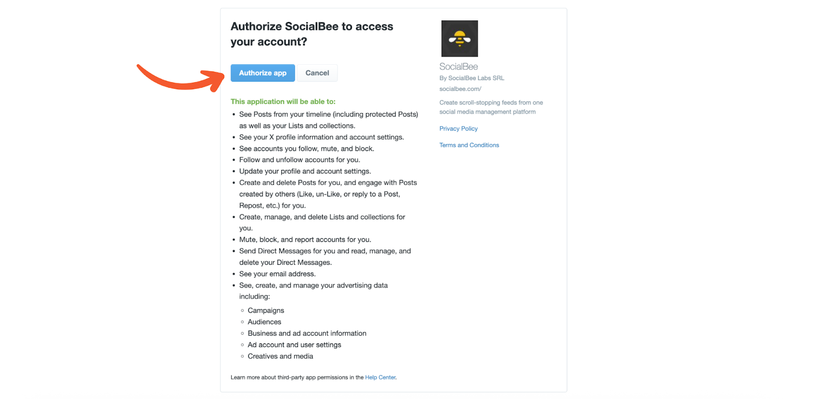 1. You will be prompted to sign in to your X (Twitter) profile, and then to authorize SocialBee to post for you.