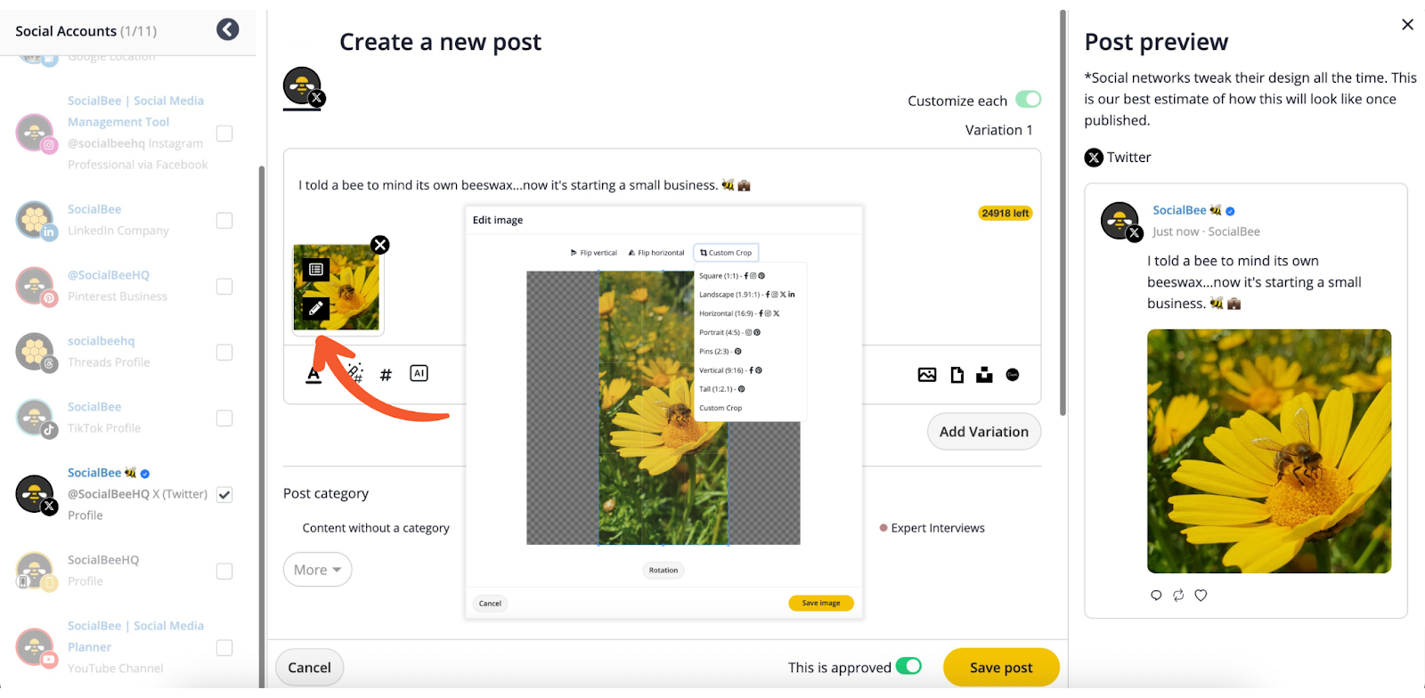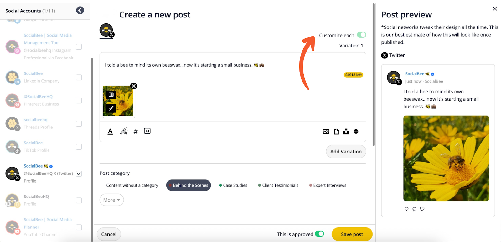 1. If posting to multiple platforms, turn on “Customize each” to fine-tune the captions and images for every new tweet in seconds.