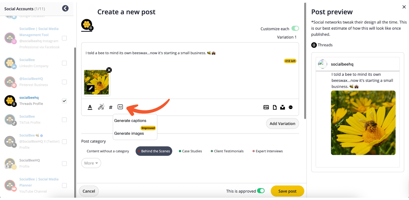 • Text posts: Write and publish plain text posts to share updates, opinions, or interesting facts directly from SocialBee.