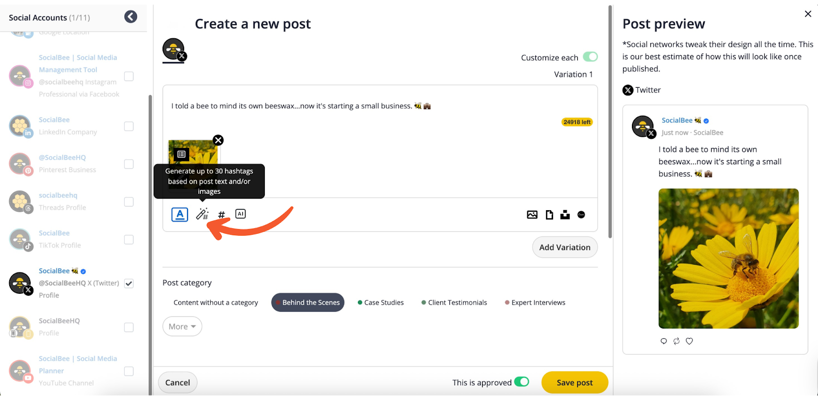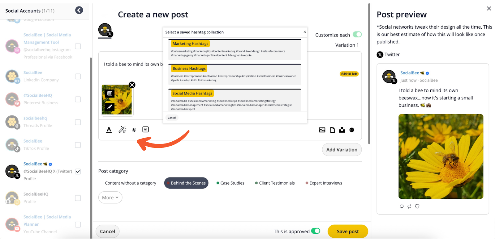 1. Use the Hashtag Generator (wand + hashtag icon) to generate relevant hashtags for your caption and media.