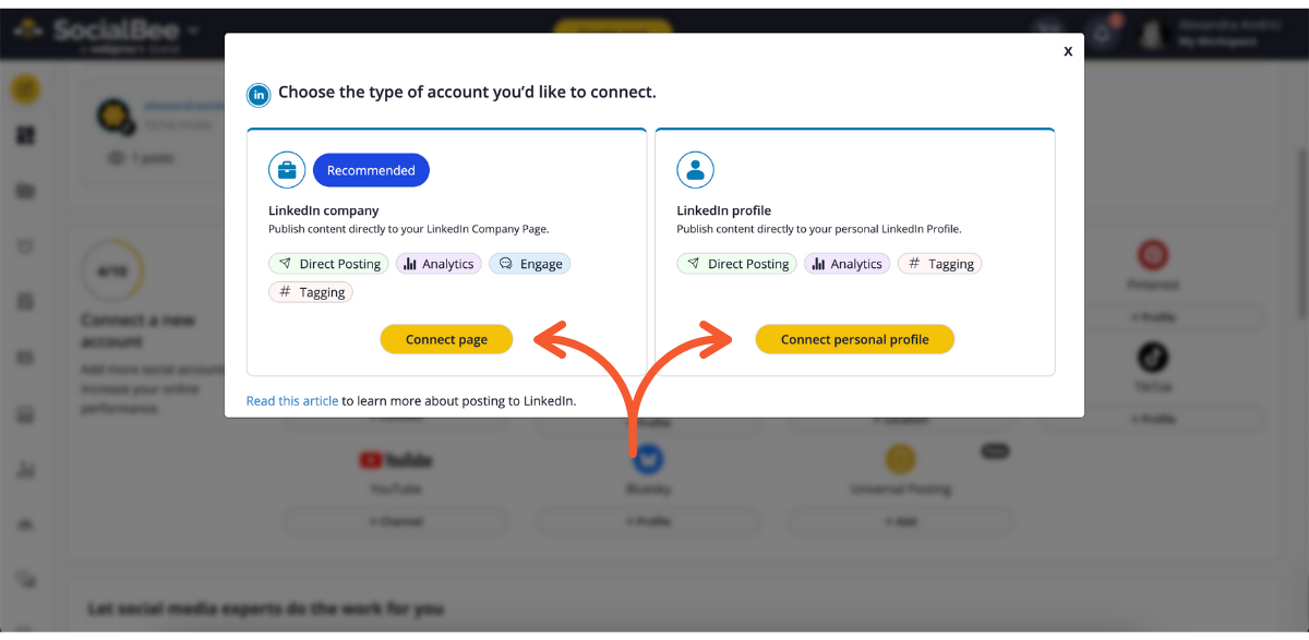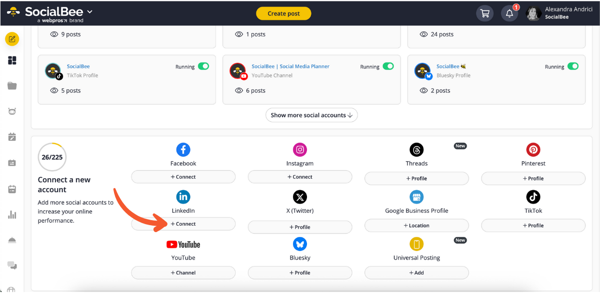 Before you can schedule or publish LinkedIn posts from SocialBee, you’ll need to connect your LinkedIn profile or company page by following these steps: