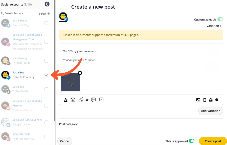 You can create, schedule, and publish LinkedIn carousels directly from SocialBee. The process is straightforward: upload your document, write your caption, choose your timing, and let SocialBee handle the publishing at the right time.