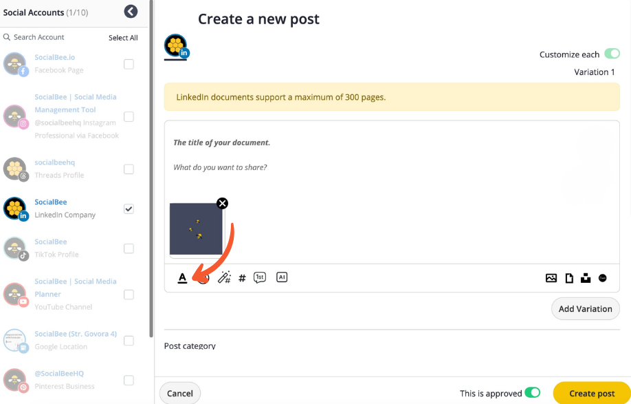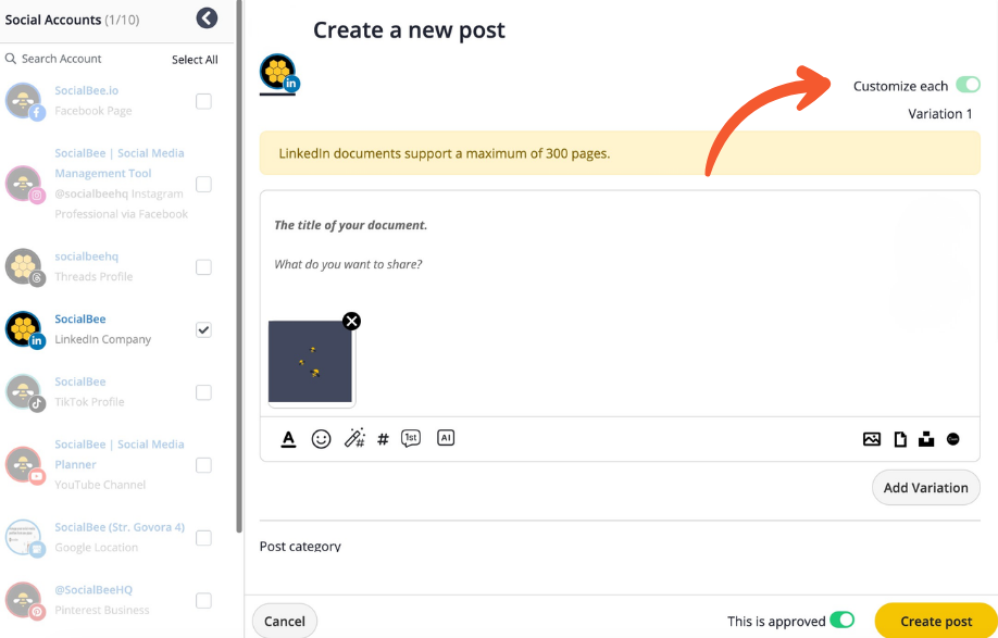 - Document title: You can set and schedule the carousel title directly from SocialBee