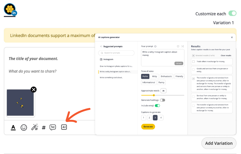 - Write your caption in the editor, or use the AI assistant to generate LinkedIn post ideas, text, or images.