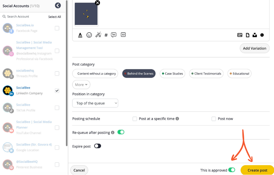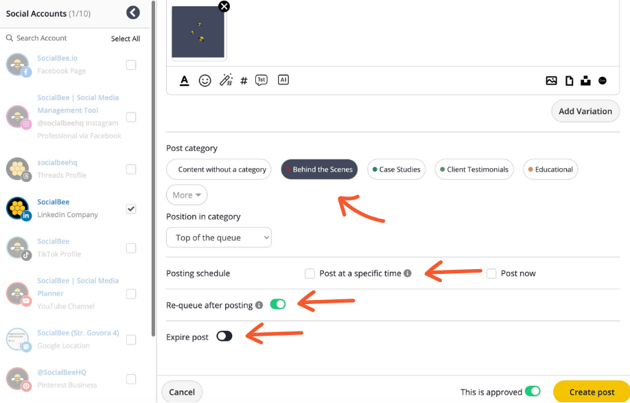 - If you want the post shared again automatically, enable “Re-queue after posting.” If it’s time-sensitive, turn on “Expire post” to stop it after a set date.