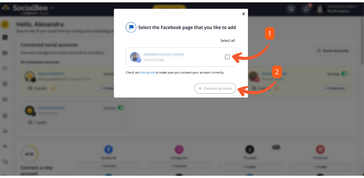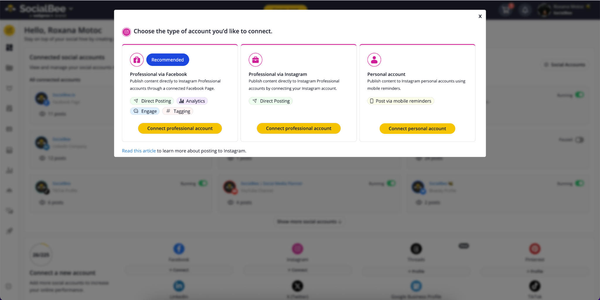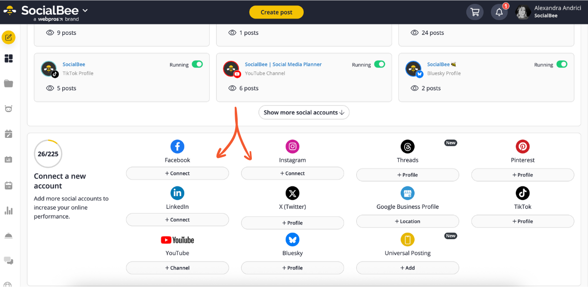 Once connected, both accounts will appear in your SocialBee dashboard and will be ready for publishing.