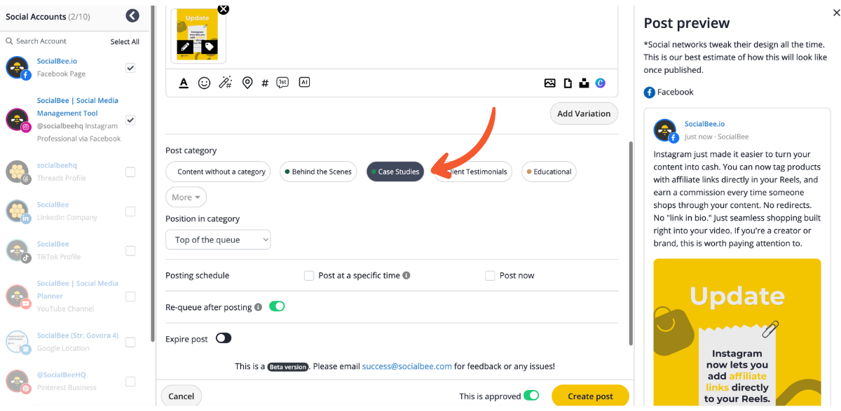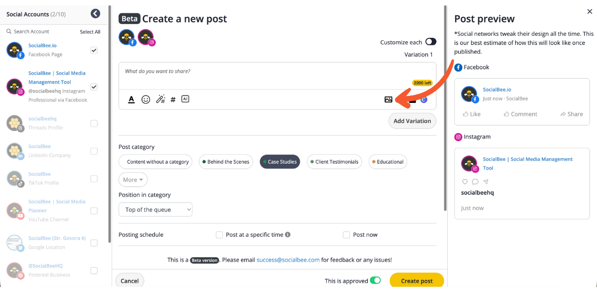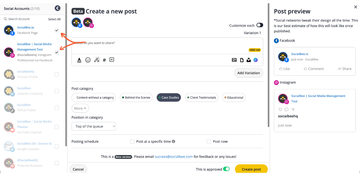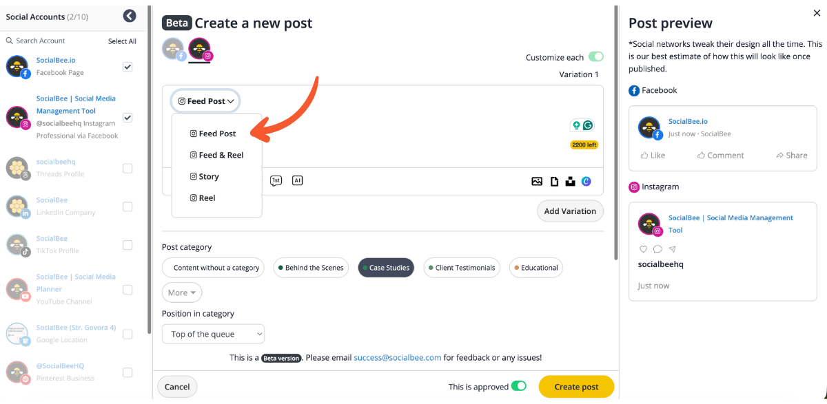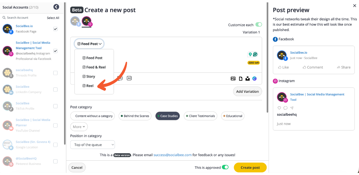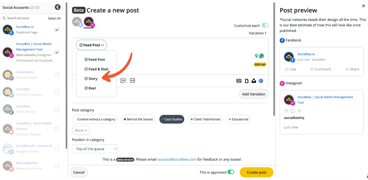 If you want more control, SocialBee gives you a better option to share Instagram and Facebook Stories, Reels, and Feed posts. You can create one post, select both platforms, customize each version separately, and publish or schedule them together without relying on Meta’s built-in sharing settings.