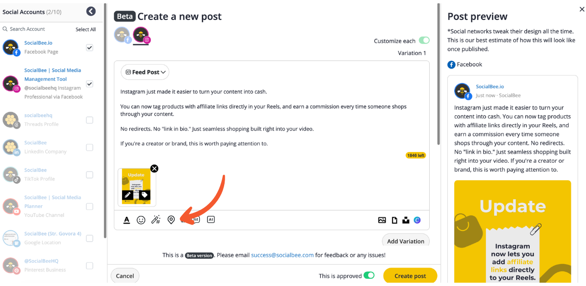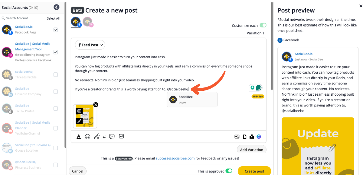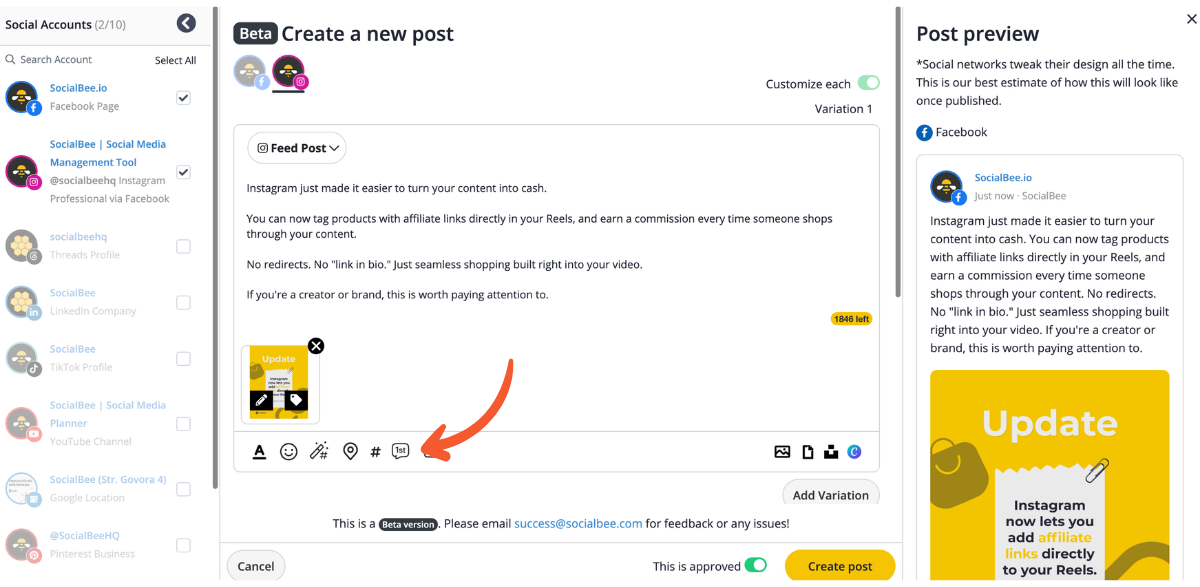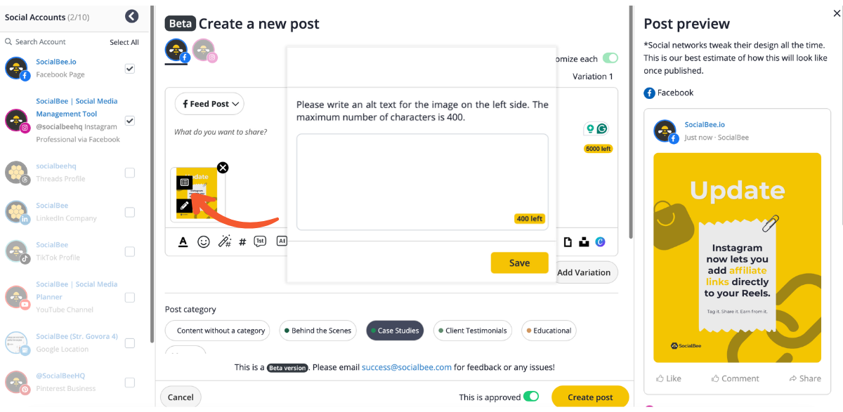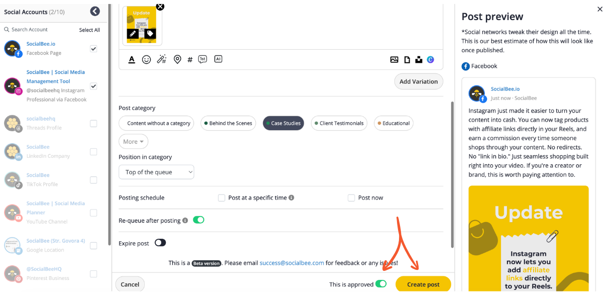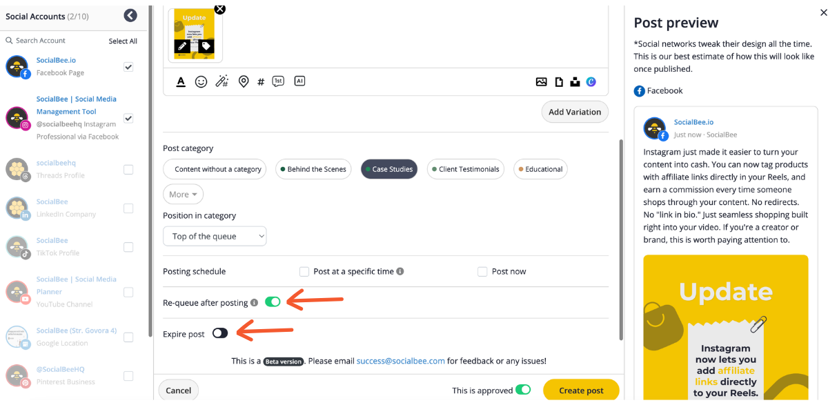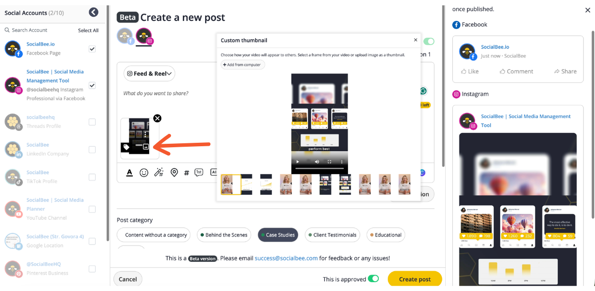 If you want more control, SocialBee gives you a better option to share Instagram and Facebook Stories, Reels, and Feed posts. You can create one post, select both platforms, customize each version separately, and publish or schedule them together without relying on Meta’s built-in sharing settings.