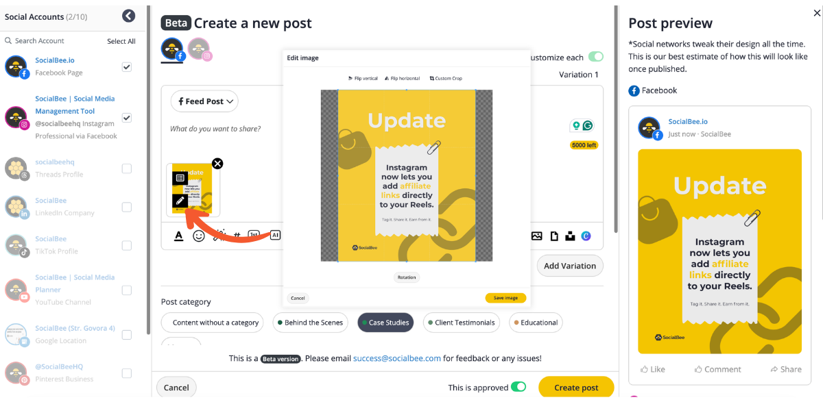 - Edit your visuals by cropping, resizing, or flipping them to fit each platform.