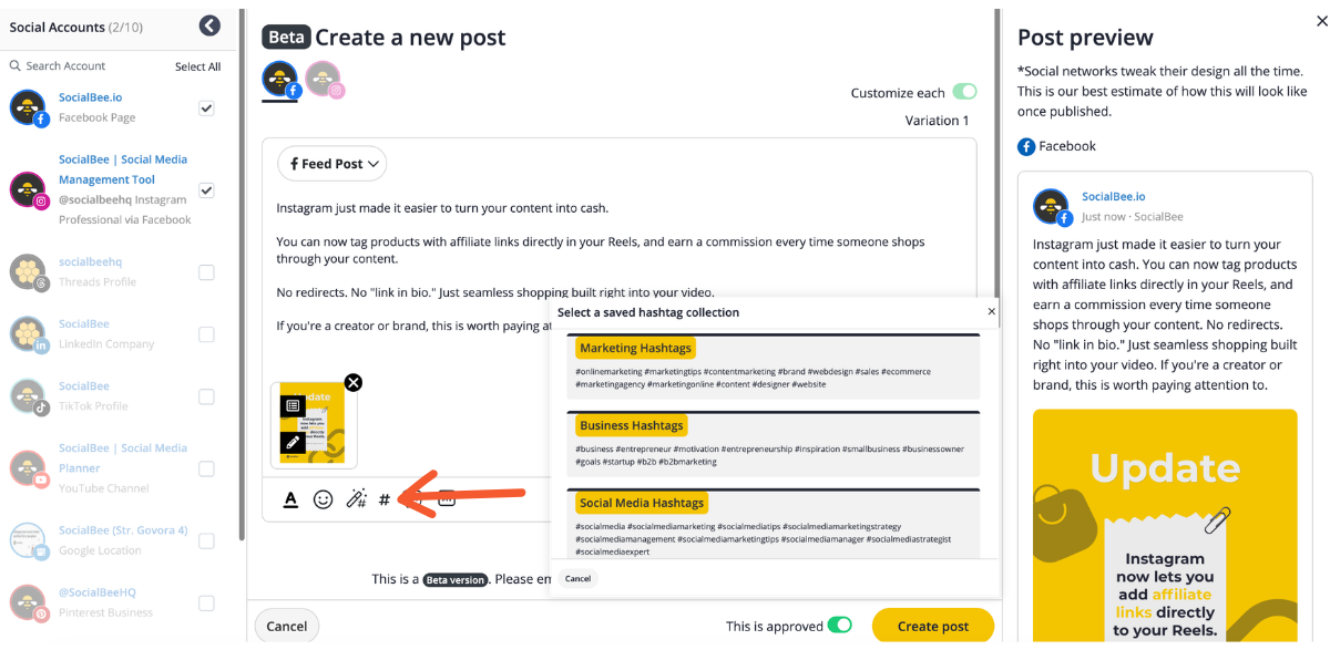 - Use the Hashtag Generator (wand + # icon) to generate Instagram hashtags, or click the # icon to insert saved hashtag collections.