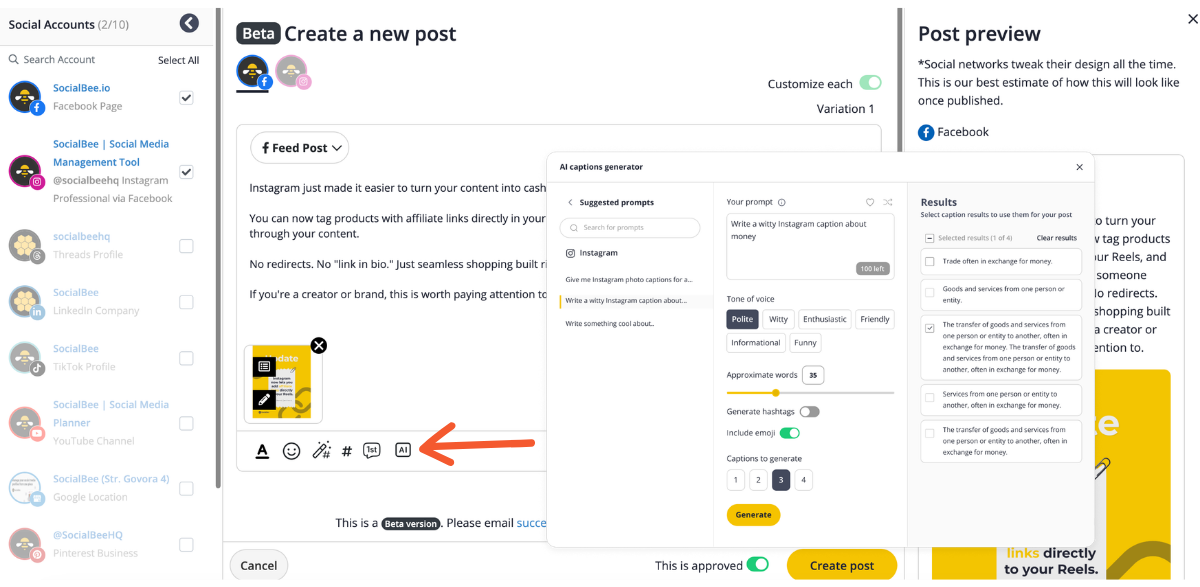 That’s where third-party tools like SocialBee become a better option if you don’t want to post on Facebook and Instagram manually. Instead of duplicating Instagram posts or relying on a simple toggle, you can create one post and then use “Customize each” to tailor it for Facebook and Instagram from the same place. You can remove links, adjust the caption length, add hashtags, and format each version properly before publishing.