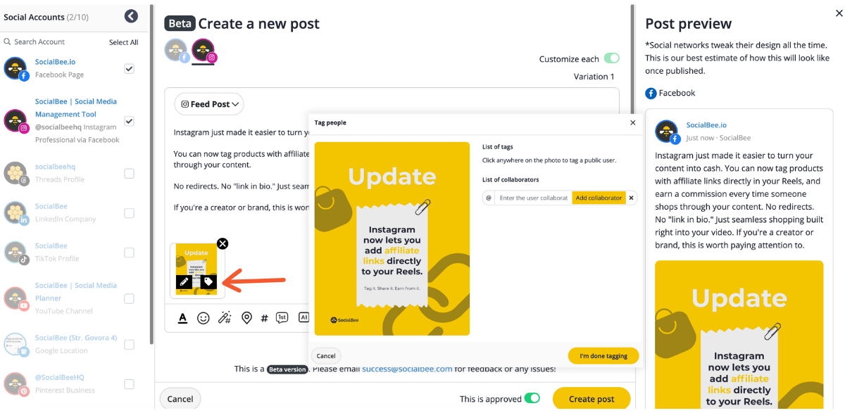 - (Instagram feature) Click the “Tag” icon on the post preview, enter the collaborator’s username, then click “Add collaborator.” You can add up to 5 collaborators, then click “I’m done tagging.”