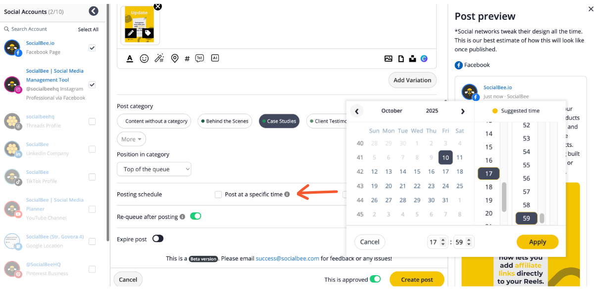 - Choose “Post now” to publish immediately or “Post at a specific time” to schedule it for later. SocialBee will suggest the best times based on your previous performance.